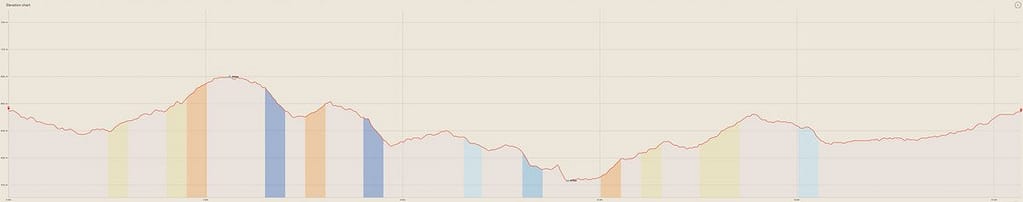 Volgens de app van Visorando was deze wandeling 10,27 kilometer lang met een hoogteverschil van 160 meter. De AllTrails app geeft aan dat het 11,34 kilometer is met een hoogteverschil van 286 meter. Volgens Google Earth Pro is het 10,2 kilometer met een hoogteverschil van 230 meter.