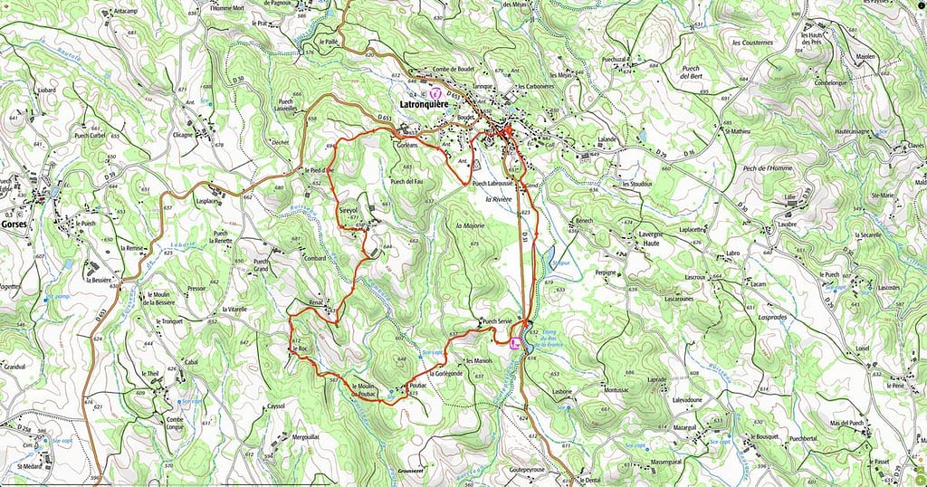 De wandeling begint op de parkeerplaats bij “Place de la Poste” in Latronquière. De wandelroute is goed aangegeven met gele markeringen. Het is moeilijk om deze wandeling van punt tot punt te beschrijven. We zullen het proberen kort samen te vatten. De bijgaande video laat het veel beter zien.