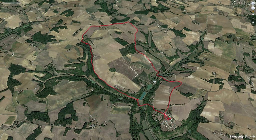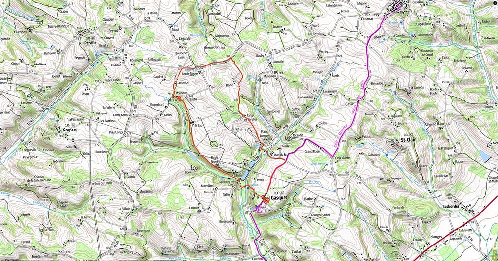 Het bord in Gasques geeft aan, dat de wandeling 9 km is. De app’s op de telefoon denken daar het volgende over. Volgens de app van Visorando was deze wandeling 7,81 kilometer met een overbrugd hoogteverschil van 154 meter. De AllTrails app geeft aan dat het 8,68 kilometer is met een hoogteverschil van 215 meter. Volgens Google Earth Pro is het 7,79 kilometer met een hoogteverschil van 254 meter.