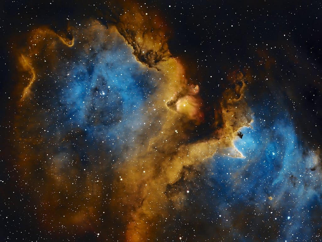 Onderstaande kleurenfoto is mijn interpretatie, omdat ik de gebruikte filters zelf aan de kanalen rood, groen en blauw toeschrijf. Ik heb nu het SHO-kleurenpalet gebruikt. SII heb ik toegewezen aan het rode kanaal, Ha aan het groene kanaal en OIII aan het blauwe kanaal. Dit is het kleurenpalet wat NASA ook gebruikt voor de foto’s van de Hubble telescoop.