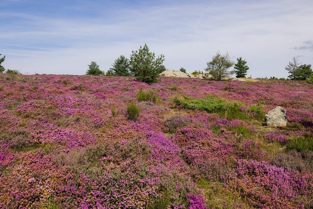 Het landschap waar we doorheen wandelden was erg divers, hele stukken waar weinig heide stond maar volop brem, enorme heidevelden, een gedeelte met turfgrond en delen met verschillende soorten bos. We hebben werkelijk genoten van deze dag en hebben de omgeving al op de lijst staan voor volgend jaar als de brem in bloei staat. Dan kleurt deze omgeving waarschijnlijk geel. We verwachten dat het in mei, begin juni het geval is. We bellen wel weer met het Office de Tourisme voor de planning.