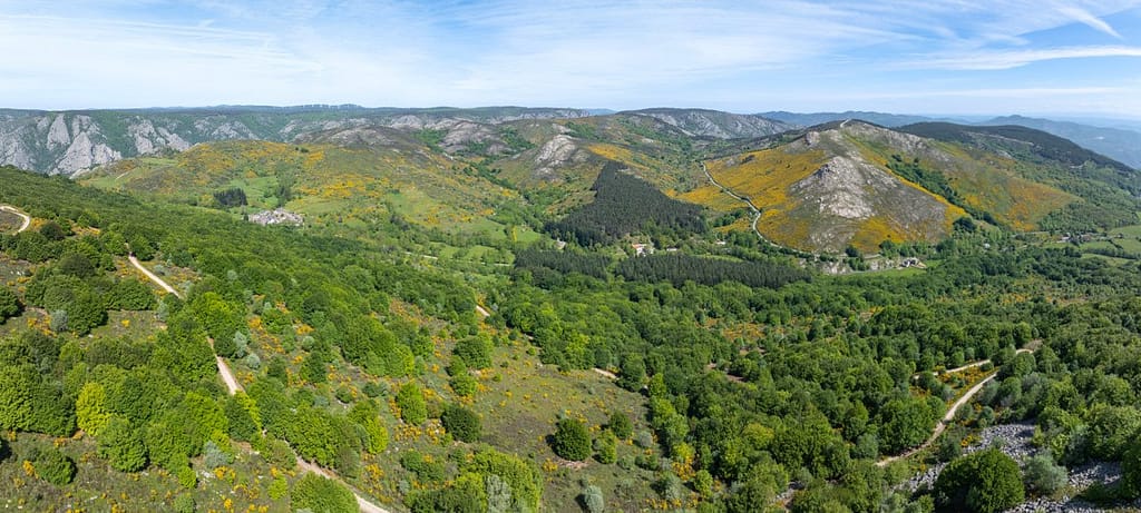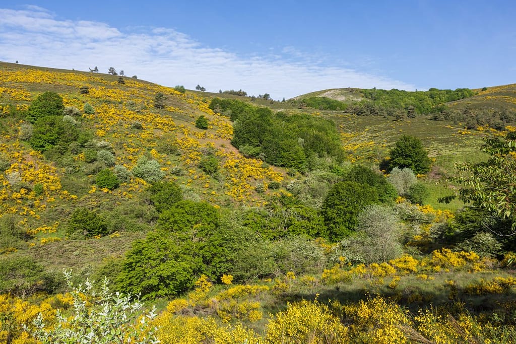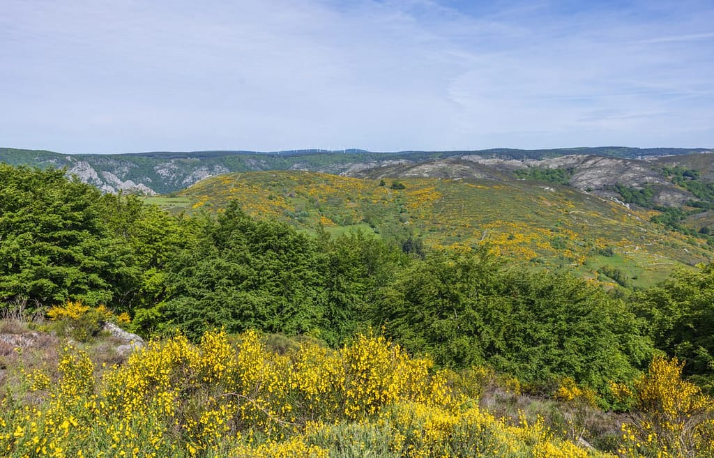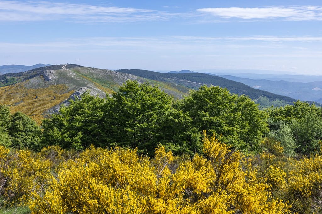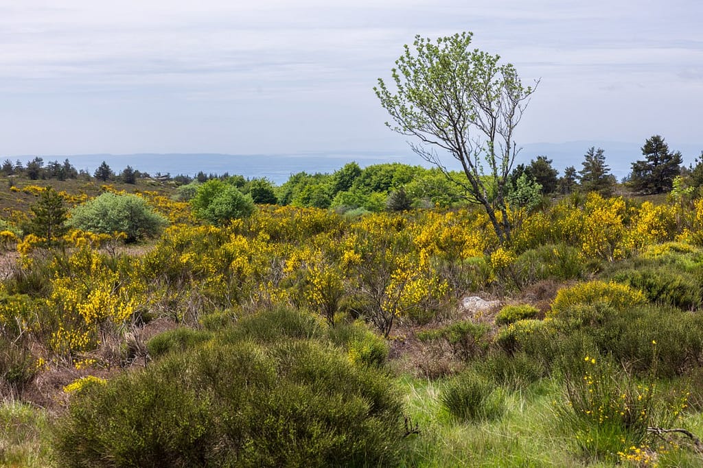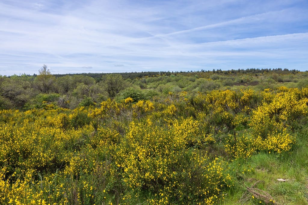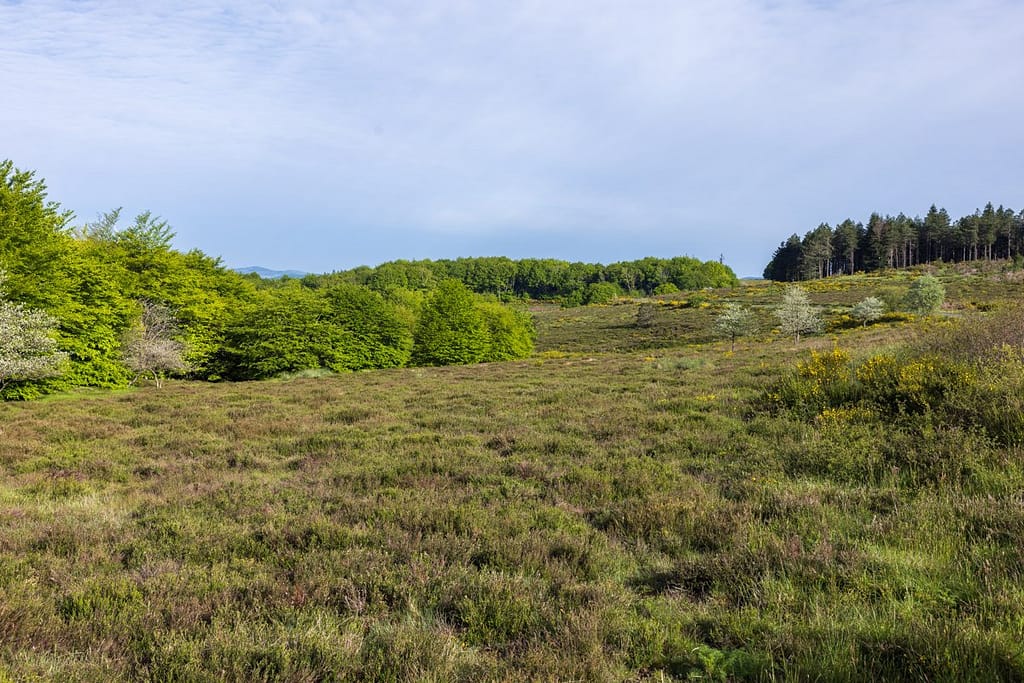 Vanaf dit veengebied lopen we door naar het uitzichtpunt aan de andere kant van het plateau. We passeren een gevarieerd gebied met zowel brem als heide en moeten een stuk door een naaldbos.
