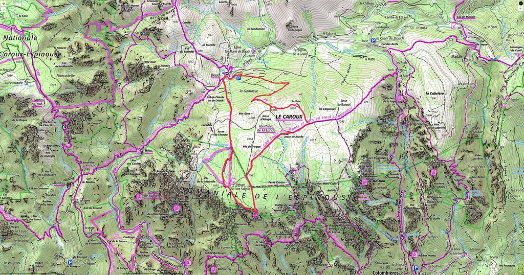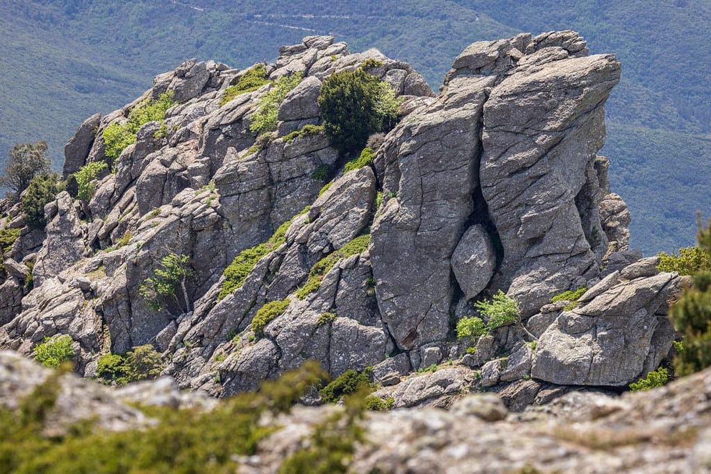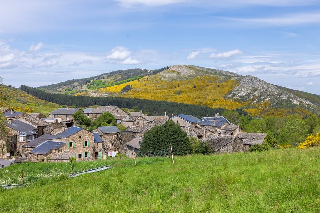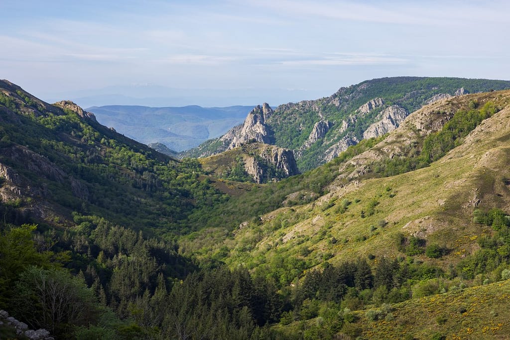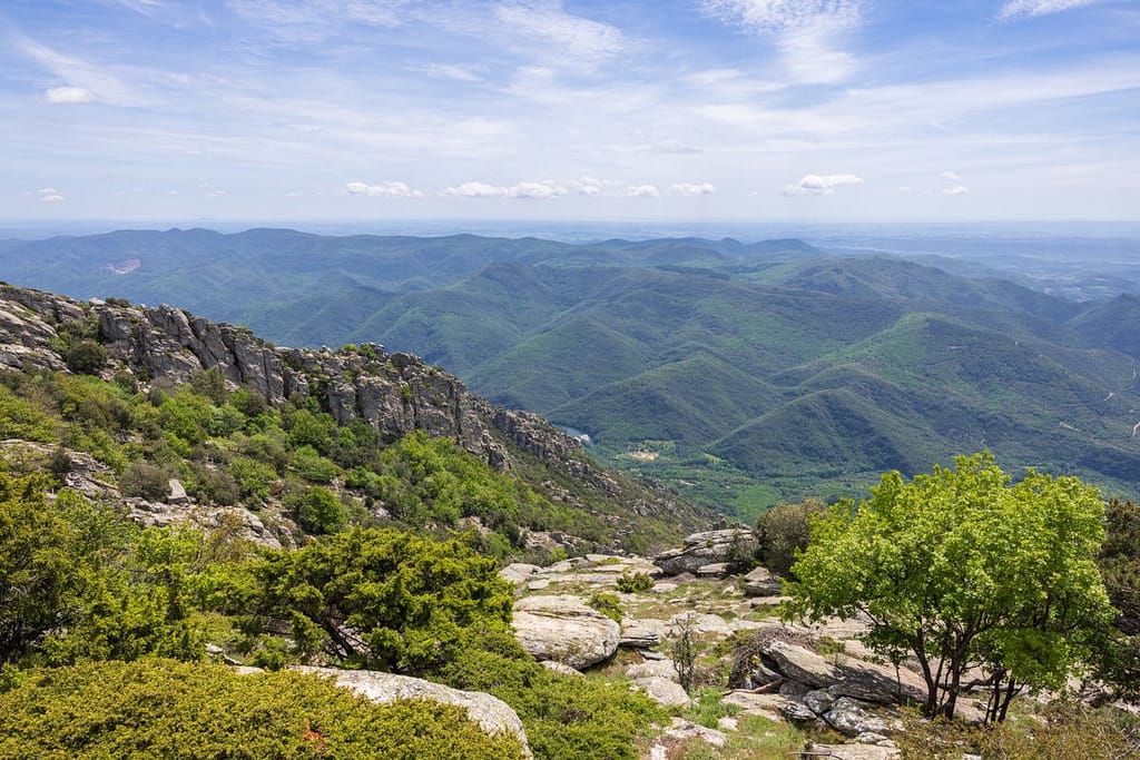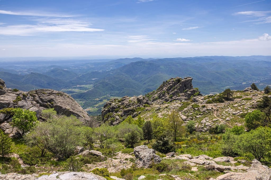 Vanaf hier moeten we nog 10 minuten rijden naar de parkeerplaats bij het dorpje Douch. We genieten volop van de route erheen. Eenmaal aangekomen starten we met de wandeling aan de achterkant van de parkeerplaats. Wederom kiezen we ervoor om de wandeling in tegengestelde richting te gaan lopen, dit vinden we de beste manier. Vanaf het begin hebben we meteen mooi uitzicht over de omgeving en komen op “Le Caroux” aan na een relatief korte wandeling. Via de officiële route kom je pas in het laatste gedeelte van de wandeling op deze locatie aan. Kijk de hele video, dan zul je begrijpen wat we bedoelen.