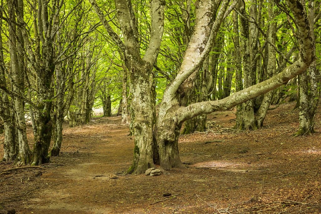Dan vervolgen we onze wandeling en lopen eerst door een naaldbos, passeren vervolgens een klein open gedeelte en lopen daarna door een loofbos met grote en grillige bomen.