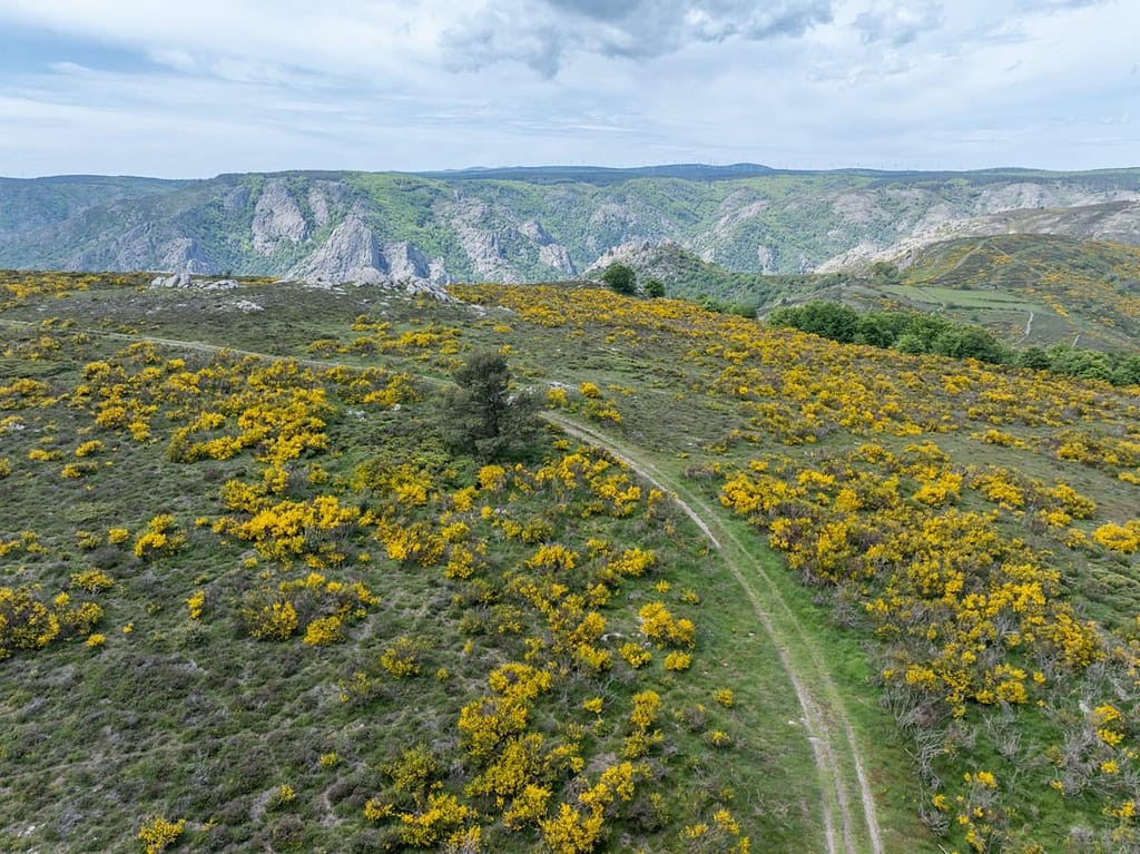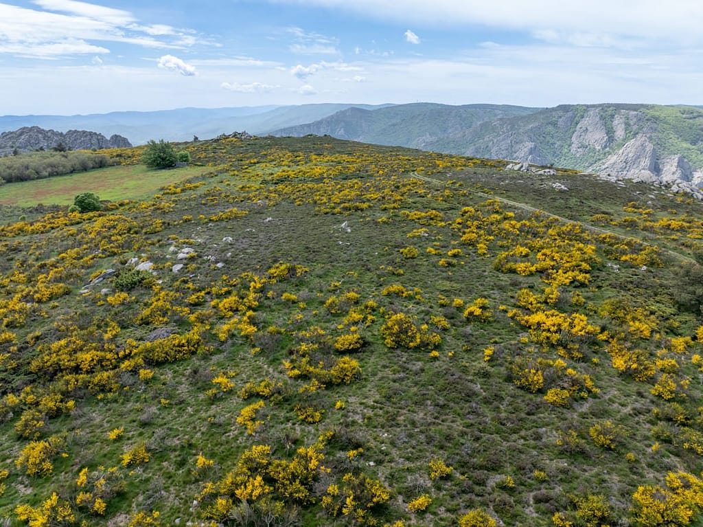 En het werd steeds mooier. Op een gegeven moment passeerden we een gedeelte waar zoveel brem stond, dat we de auto geparkeerd hebben om foto’s te maken en te gaan vliegen met de drone. Dit gedeelte zien we later terug als we naar boven lopen bij Mont Caroux.