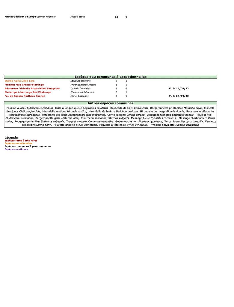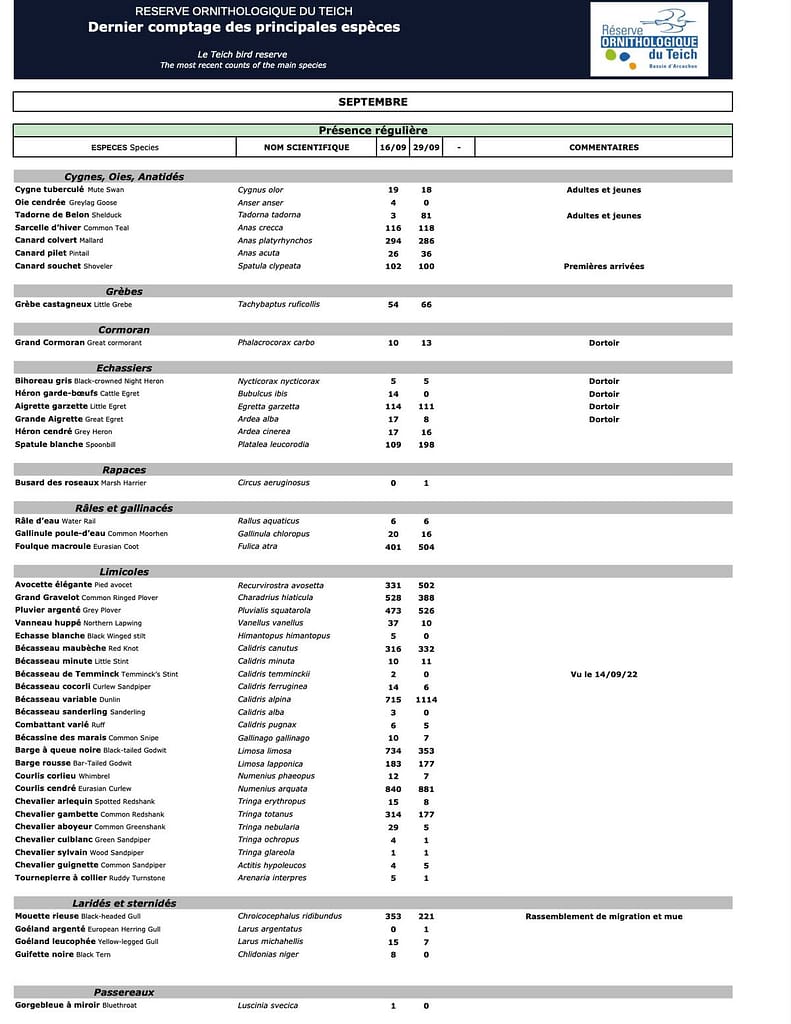 De link naar de website van Réserve Ornithologique du Teich. Op deze website staan ook maandelijkse tellingen van de vogels in dit gebied. Onderstaand de telling van september 2022.