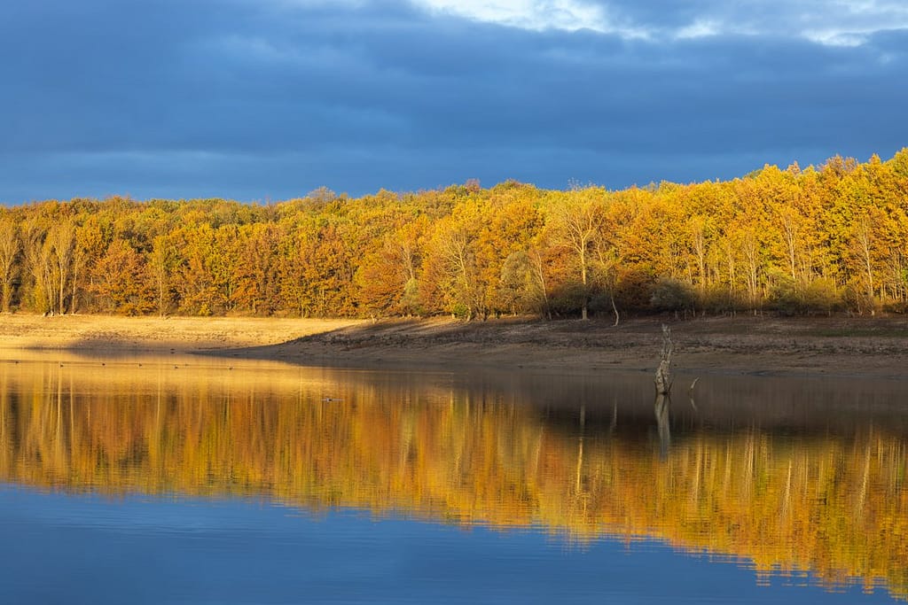 De zon kwam steeds meer tevoorschijn naarmate het later werd. Hierdoor werden de herfstkleuren intens. We zijn dit keer niet tot aan de vogelobservatiehut doorgelopen, maar in het eerste gedeelte gebleven. Het is 6 december en de korste dag van het jaar is niet ver meer weg. Nog een paar foto’s en dan zit dit korte bezoek aan het stuwmeer Lac de Gouyre er op.
