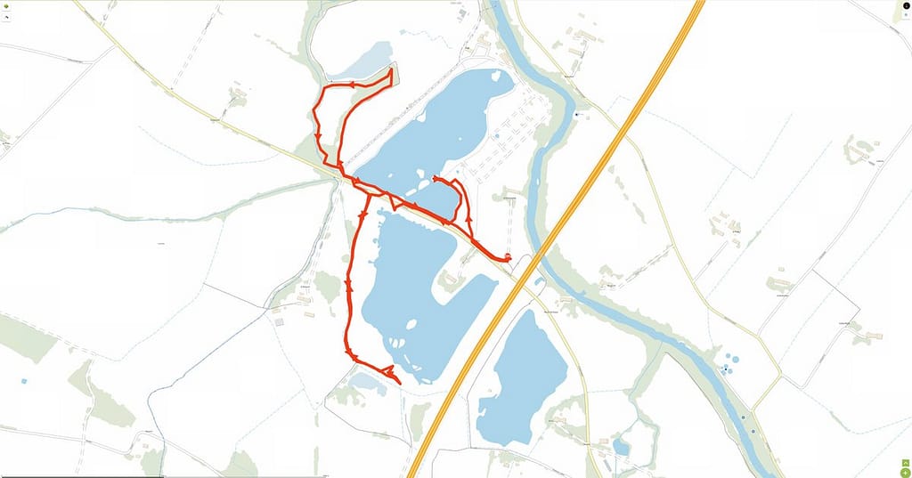 Onderstaand de route die we gelopen hebben, bij het meer aan de andere kant van de snelweg zijn we niet geweest. De wandeling is 4 kilometer lang volgens Visorando.