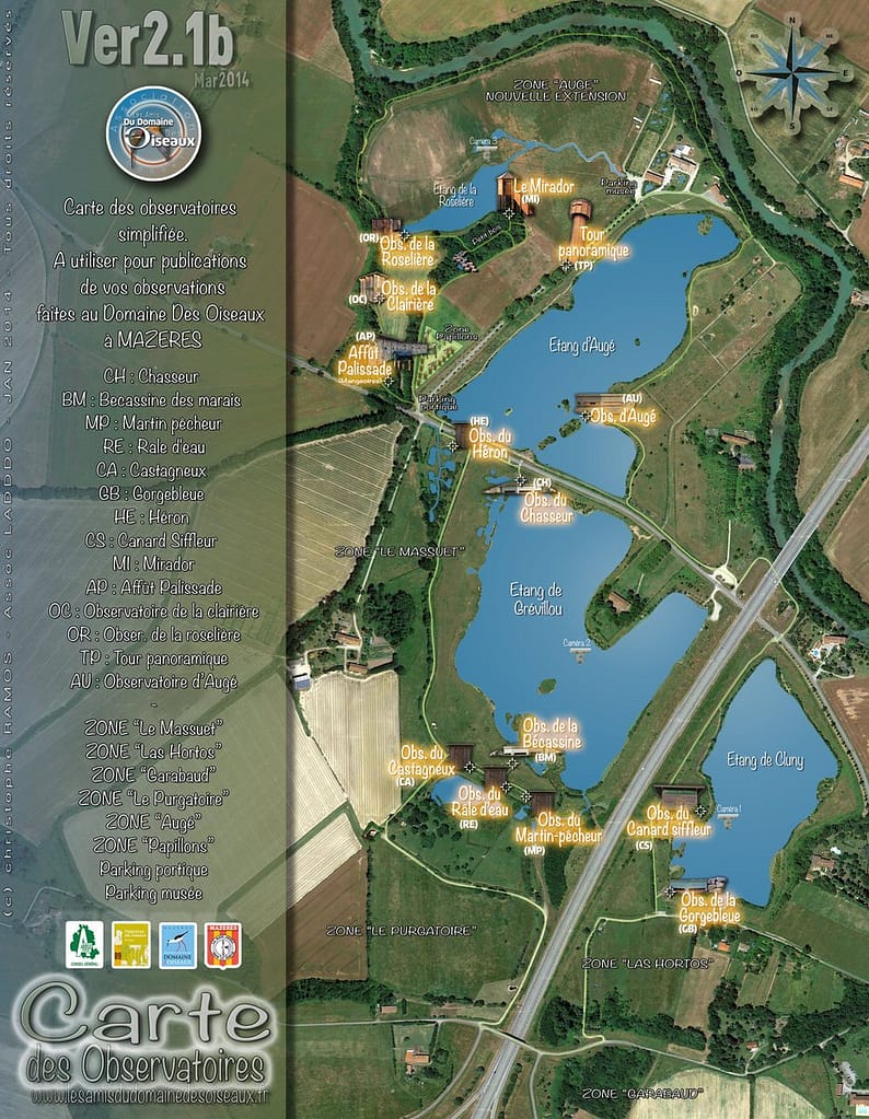 Onderstaand een kaart met daarop aangegeven alle observatiehutten, die langs de meren staan. Deze kaart komt van de website van de vrienden van de Domaine des Oiseaux. Ik zet de link naar deze website onderaan de pagina. Het is een website in het Frans, maar de links naar de vele foto’s zijn makkelijk te vinden. Klik op de kaart om deze te vergroten.