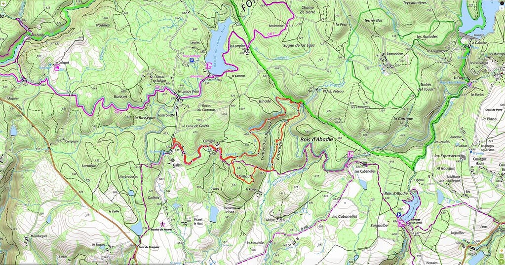 Echter, vlak voor aankomst begon het weer op te klaren en op de plaats van bestemming scheen de zon volop. We zijn gestart met de wandeling vanaf de parkeerplaats gelegen aan de D4 op 635 meter hoogte, circa 5 kilometer onder het dorpje Le Lampy Vieux. Het werd meteen duidelijk, dat er weinig herfstverkleuring was. Dit verbaasde ons. We waren vorig jaar op 25 oktober in de Montagne Noire en toen waren de bomen al een stuk verder verkleurd.