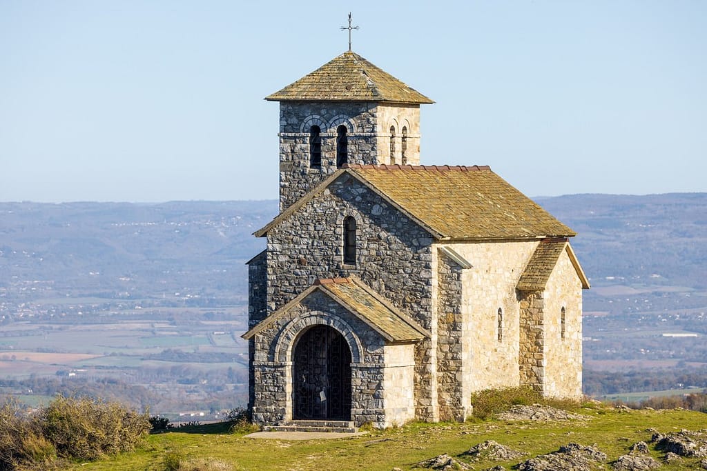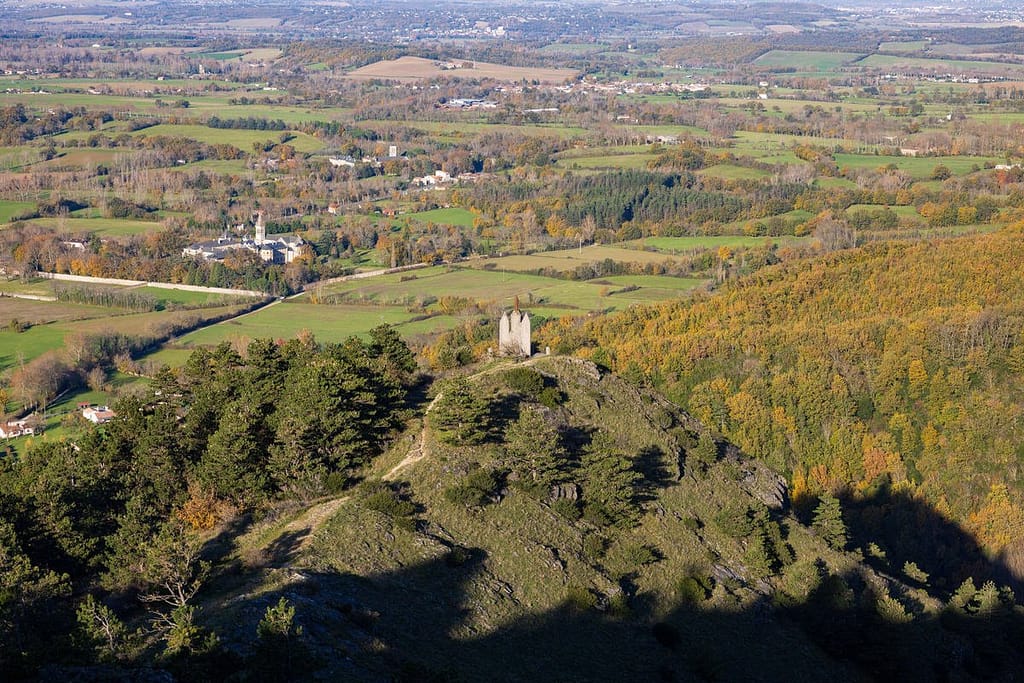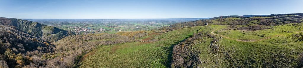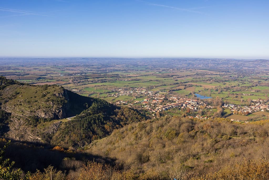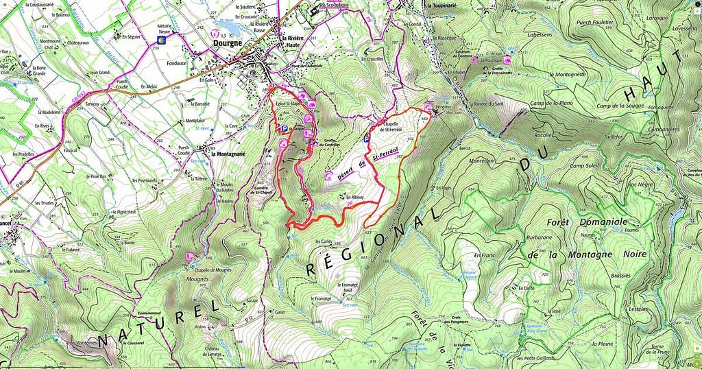 Aangekomen in het gebied Désert de St-Ferréol hebben we een mooi uitzicht op de omgeving. In de verte zien we Chapelle de St-Ferréol liggen. Door het heldere weer hebben we zelfs zicht op de Pyreneeën. Het dorpje Dourgne zien we beneden in het dal liggen, Statue St-Stapin ligt links van ons op de andere heuvel.