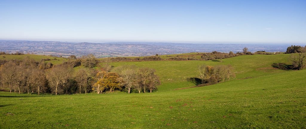 Na enige tijd lopen komen we uit op een plek waar we uitzicht krijgen. We zijn toch best een stuk omhoog gelopen. Vanaf hier kijken we nu uit over het gebied, dat voor de Montagne Noire ligt waar we vanochtend vroeg doorheen gereden zijn. We zijn nu op het hoger gelegen plateau en vervolgen de route naar La Chapelle de St-Ferréol. We moeten een stukje over de weg en daarna lopen we tussen de weilanden door richting het gebied dat de “Désert de St-Ferréol” wordt genoemd.
