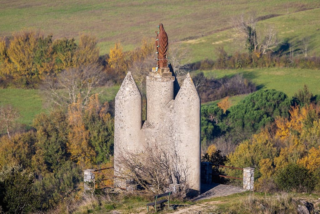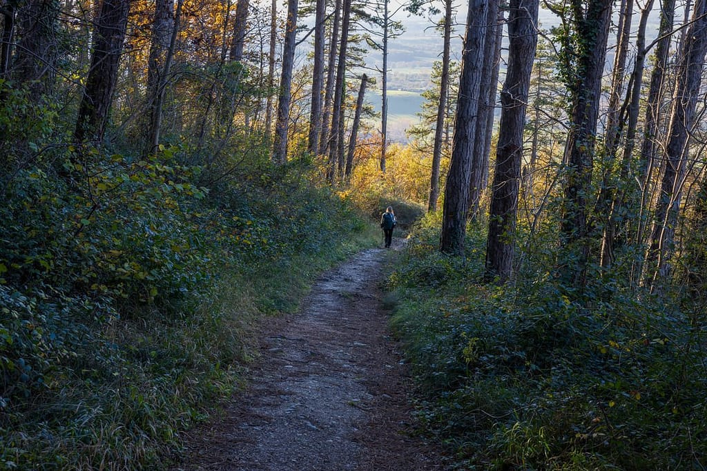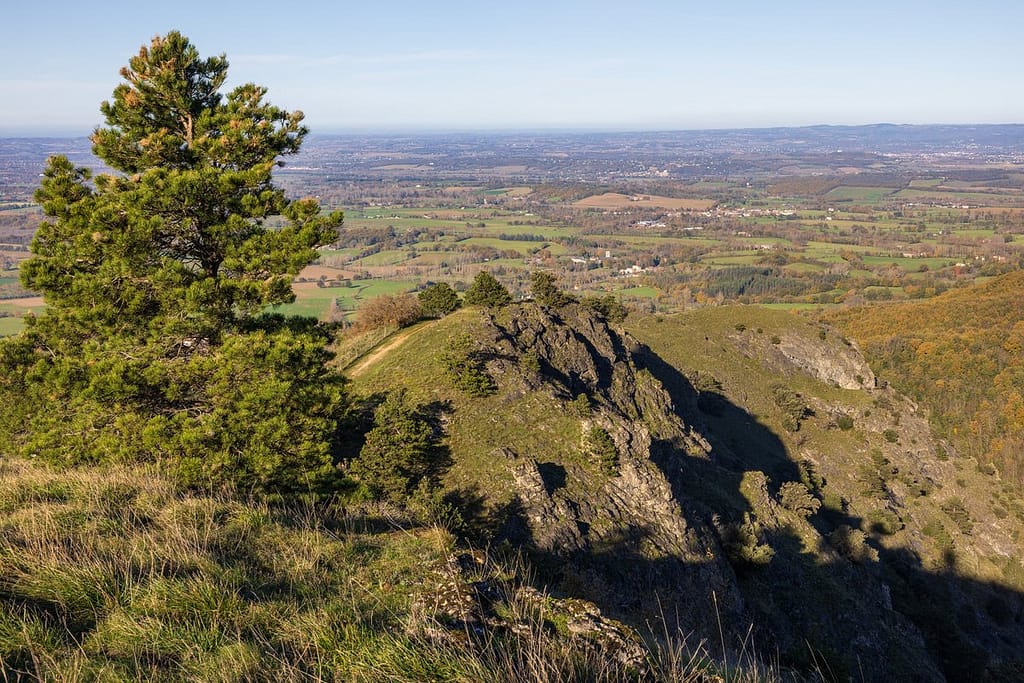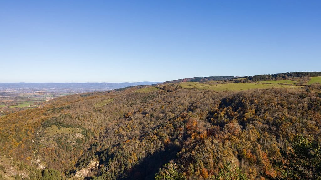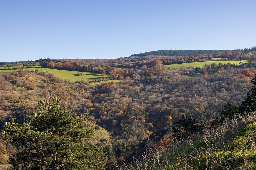 Na de korte lunch vervolgen we de wandeling een stukje over dezelfde route als we gekomen zijn. Na enige tijd slaan we linksaf om de route te volgen die naar Statue St Stapin gaat. Vanaf deze afslag moeten we ons meer inspannen. Nadat we een stuk omlaag gelopen zijn moeten we nu weer omhoog. En het gaat een stuk steiler omhoog dan gewend waren tijdens deze wandeling. We lopen deels door een prachtig verkleurd bos, voordat we weer uitzicht krijgen op de omgeving. We passeren de steengroeve “Carrière de Saint-Chipoli” en aan de overkant zien we in de verte Chapelle de St-Ferréol liggen.