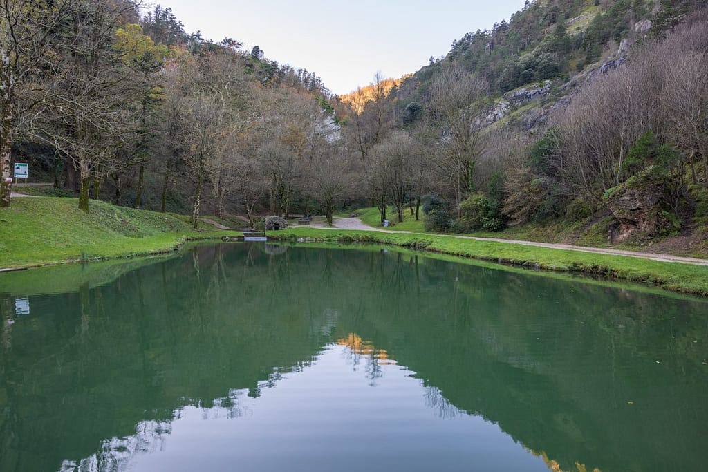 We lopen eerst een stuk over de weg naar het beginpunt van de wandeling. Het asfalt gaat over in een breed bospad en we volgen de wandelroute naar La Capellette. Aan het begin ligt een meertje en tot onze verbazing waren hier alle bomen kaal en lag er geen blad op de grond. Het leek wel of alles hier was opgeruimd.