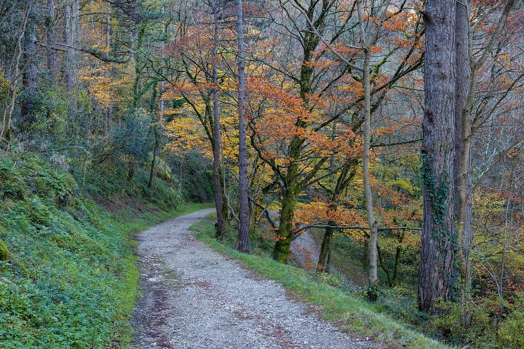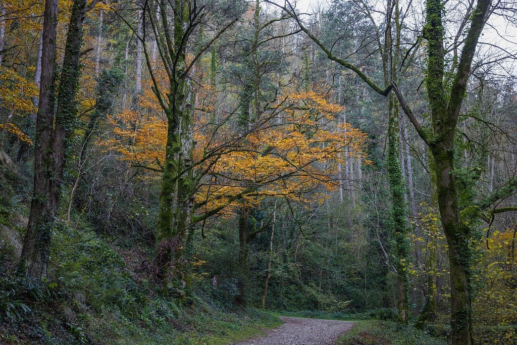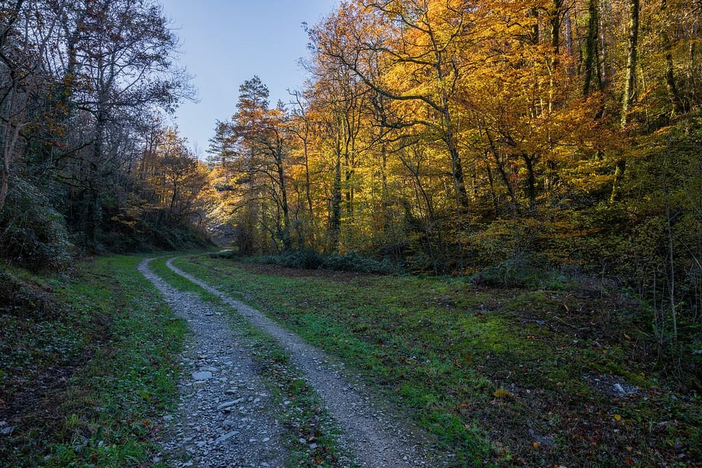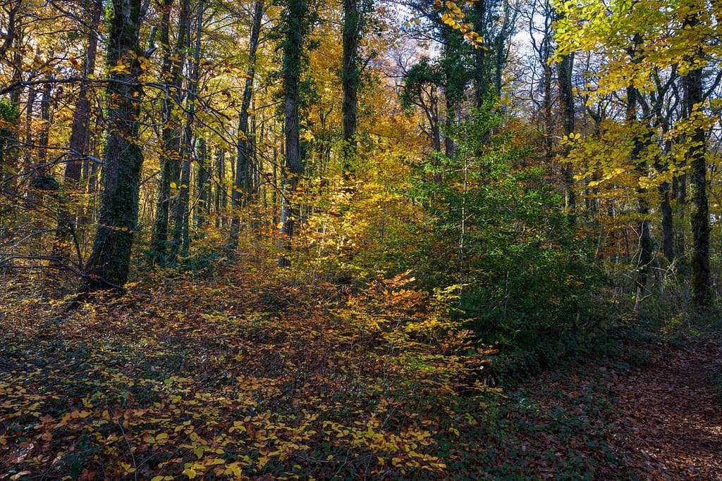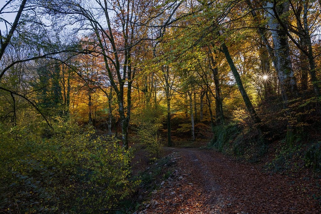 Het pad gaat geleidelijk omhoog en we lopen de Montagne Noire in. We willen vandaag nog een keer genieten van de herfstkleuren. We dachten even dat we te laat waren en er niet veel kleur over zou zijn, maar dat bleek gelukkig ongegrond. Het is een gemengd bos, een deel van de bomen is al kaal, maar de beukenbomen staan er prachtig bij.