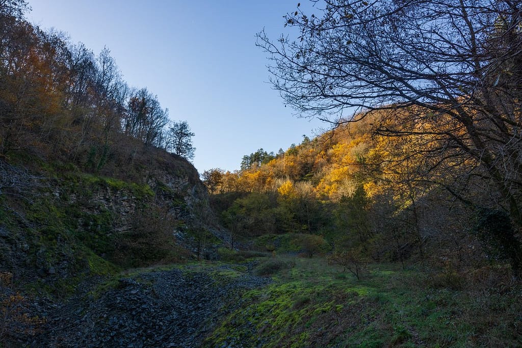 Tot nu toe vergt de wandeling niet veel inspanning. We lopen door een prachtig gebied. We passeren hellingen van leisteen en doordat het hier kennelijk het hele jaar door vochtig is, is alles mooi met mos begroeid. Hoe hoger we komen hoe mooier de herfstkleuren.
