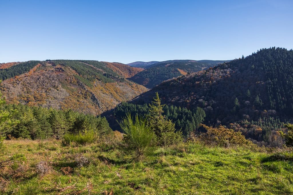 We lopen een stukje door een bos met dennenbomen, die daar voor de houtproductie zijn aangeplant. Aan het einde van dit bos is er een gedeelte wat net helemaal is gekapt, hetgeen goed te zien is op de video van deze wandeling. We vervolgen de “route forestière ” en kijken vervolgens, vanaf het hoogste punt van deze wandeling, uit over het gebied waar we net gewandeld hebben.