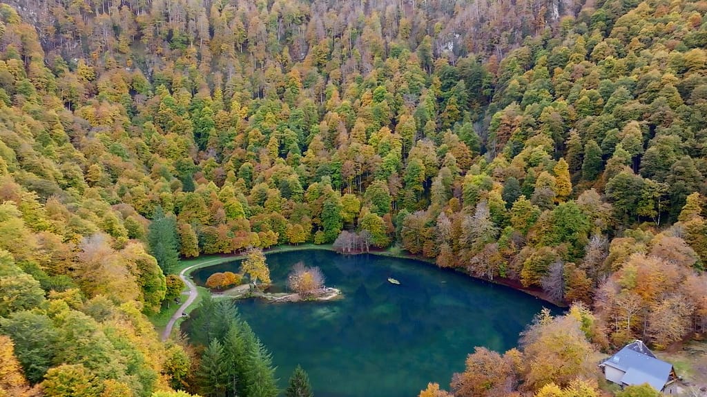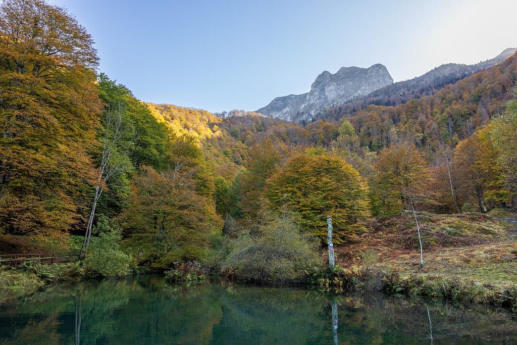 Bij de auto aangekomen nemen we de tijd om wat te eten voordat we doorrijden naar Lac Bethmale. Het meertje ligt op 1074 meter hoogte, maar in deze tijd van het jaar schijnt er daar nauwelijks nog zon. We verwachten dan ook dat de beukenbomen rondom het meertje wel verkleurd zijn.
