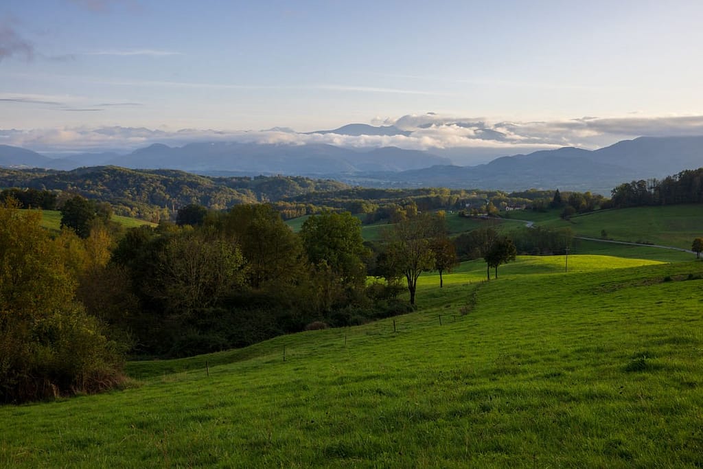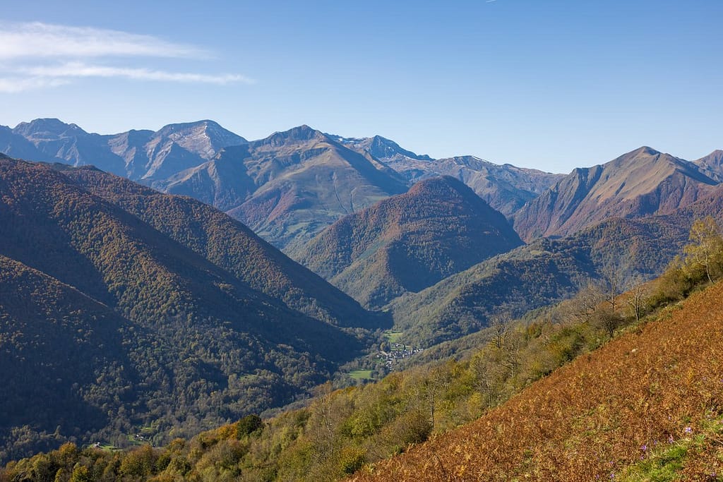 Na het bos komen we uit op de D704 bij het dorpje Balacet (933 m). We wandelen een stukje het dorp in om even te kijken, want we moeten de andere kant op. Volgens de gegevens van de Insee wonen hier slechts 47 mensen. Vanaf het dorpje lopen we het laatste stuk over de weg terug naar de auto. Het uitzicht op de Pyreneeën is vanaf de weg gezien erg mooi.