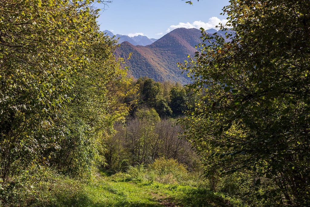 Vanaf hier lopen we dan verder omhoog en vervolgen de route naar de Col de l’Arraing. Het pad wordt minder steil en uiteindelijk lopen we over een licht stijgend pad onderaan de bomenrij, zichtbaar op bovenstaande foto. Hier zijn ook de eerste herfstkleuren zichtbaar. In het bos waar we doorheen gelopen zijn op onze weg omhoog waren de bladeren nog groen.