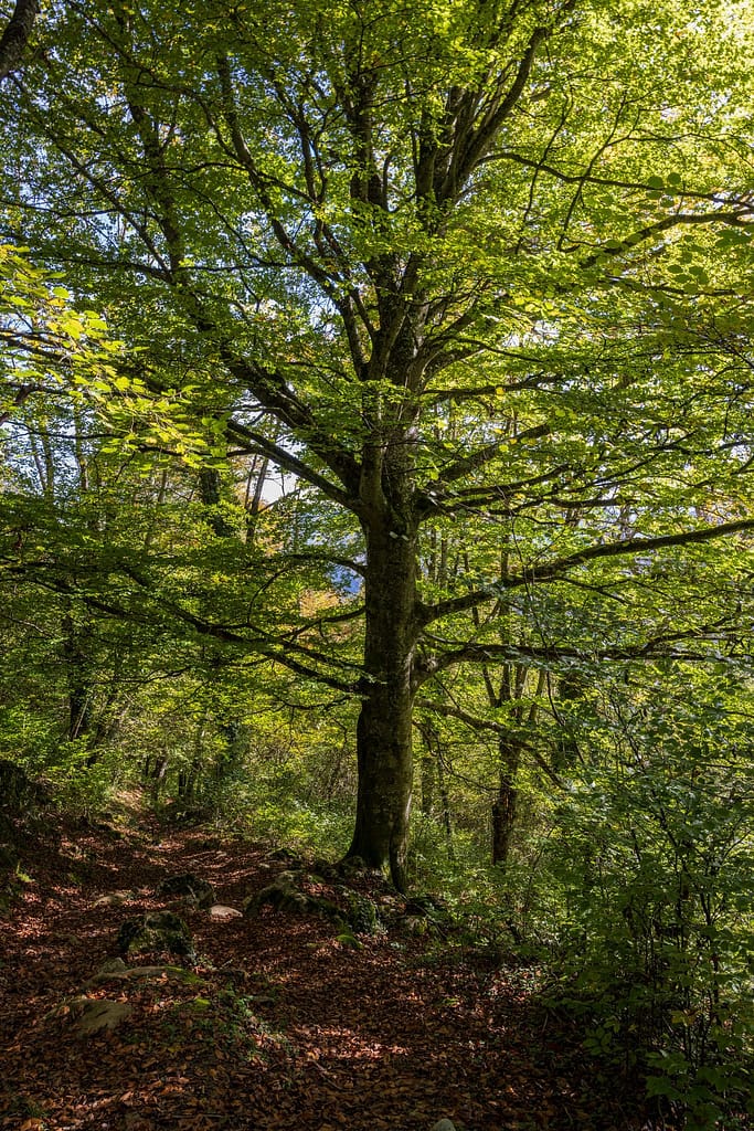 Uiteindelijk lopen we weer het beukenbos in. Het pad door het bos gaat ook steil omlaag en door de natte ondergrond is het op sommige plaatsen erg glad. Het is een mooi bos om doorheen te lopen, alleen jammer dat het nog niet verkleurd is.