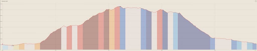 Aan het bovenstaande hoogteprofiel is duidelijk te zien waar de zware stukken van de wandeling zich bevinden. De steile afdaling is goed zichtbaar aan de rechterkant.