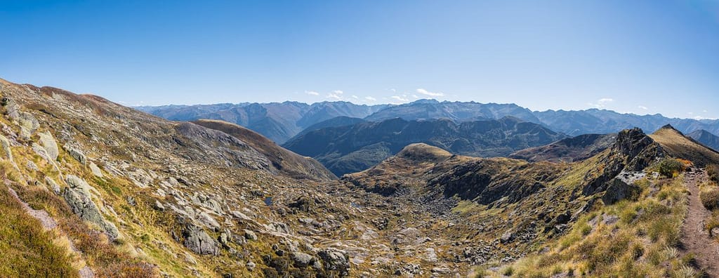 Tijd om verder te gaan. Het zal nog wel even duren voor we weer bij de auto zijn. De wandeling gaat verder over de bergkam. We lopen hier afwisselend omhoog en omlaag en komen via Pic de Barrès en nog twee andere toppen, waar we overheen moeten, aan op het punt waar we echt gaan afdalen. Omhoog gaat ieder keer wel, maar naar beneden gaat moeizaam. Ik steun echt veel op mijn wandelstokken bij het naar beneden gaan.