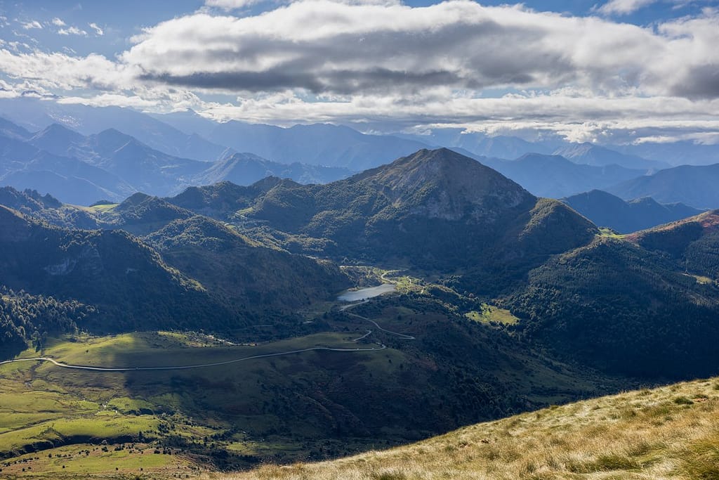 We kijken naar beneden, zien in de diepte de parkeerplaats liggen, en beseffen dan dat het een erg steile afdaling is. Dit gaat de langstdurende afdaling worden, die we ooit gemaakt hebben. Maar het uitzicht is prachtig met de wolken die zich ontwikkelen boven de Pyreneeën. In de verte ligt Étang de Lers.