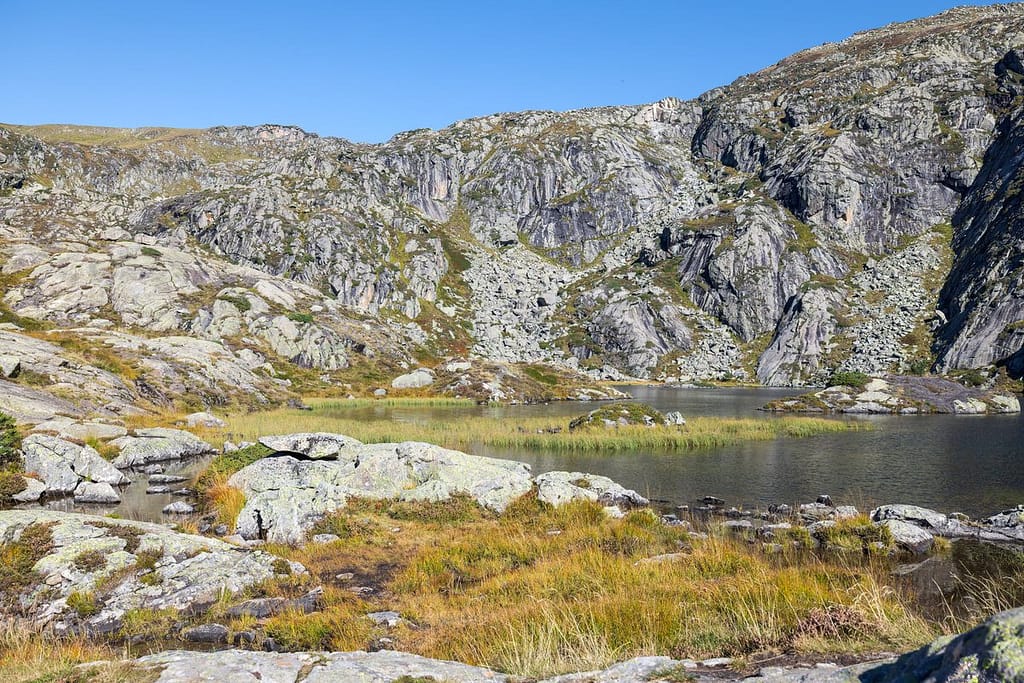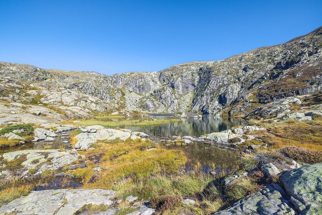 Uiteindelijk komen we aan bij Étang d’Arbu dat volledig in de zon ligt. Het is een prachtig gezicht. De verkleurde grassen die goudgeel zijn, hier en daar bosbessen in herfstkleuren en veel uitgebloeide heide die mooi bruin verkleurd is. Begin augustus staat de heide in bloei en ook dan zal het er hier mooi uitzien.