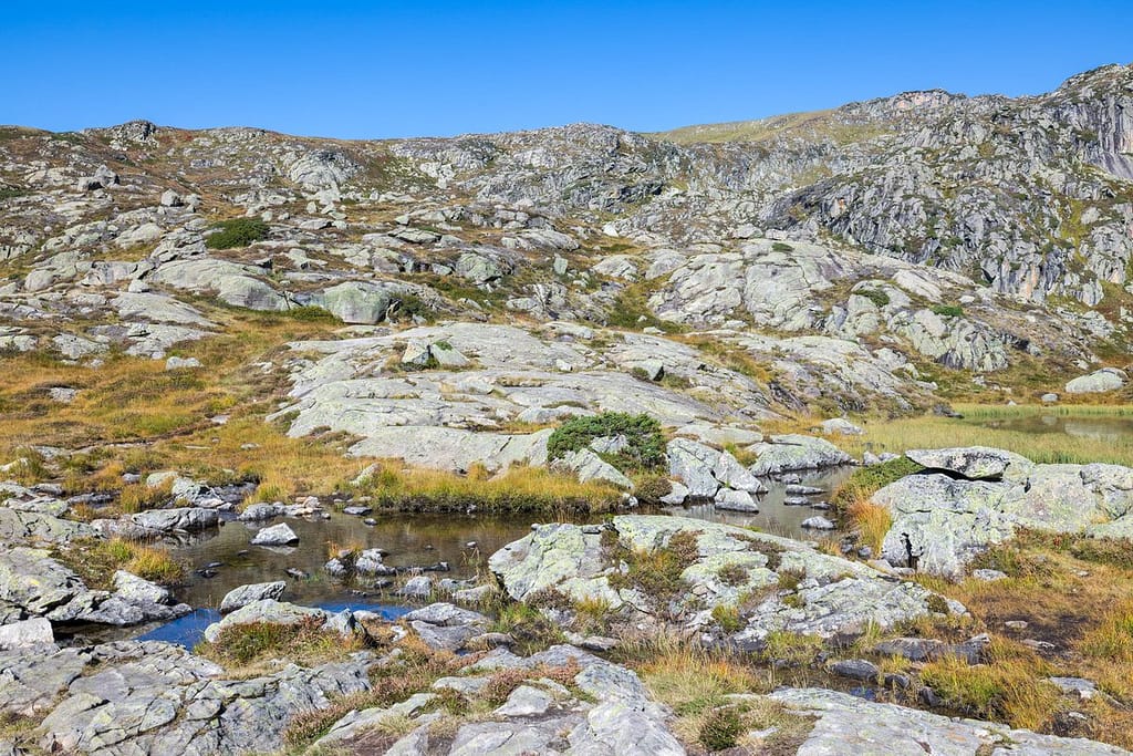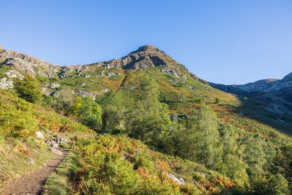 Gelukkig lopen we nog grotendeels in de schaduw, want de gevraagde inspanning is groot. We hebben af en toe zelfs onze handen nodig om onszelf te ondersteunen bij hele steile stukken. Op dit gedeelte zien we naast varens ook veel brem en bosbessen staan. In het voorjaar zal de brem, als deze in bloei staat, een mooi gezicht zijn. Nu zijn het de bosbessen die al helemaal oranje/rood verkleurd zijn.