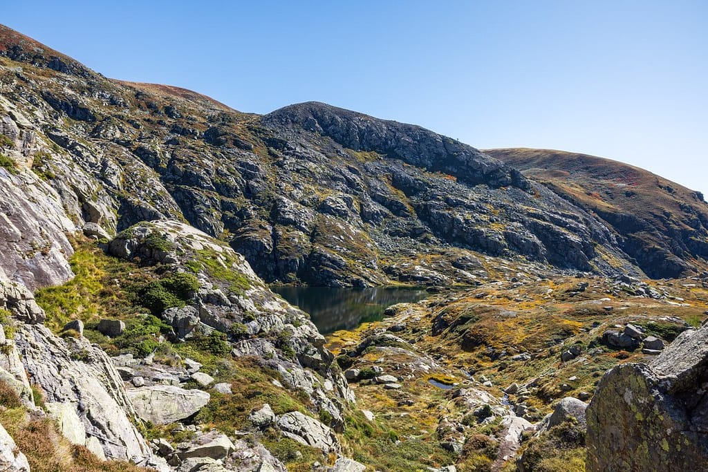 De eerste 1,4 kilometer stijgen we nauwelijks en zijn we pas op 1431 meter hoogte. Daarna begint het stijgingspercentage fors toe te nemen. Étang d’Arbu ligt op 1730 meter hoogte en vanaf het moment dat het pad begint te stijgen tot aan Étang d’Arbu is het maar 1,1 kilometer lopen. We moeten dan nog wel 300 meter omhoog. Onze hartslag loopt flink op. Het pad is steil en glad. Door de vele regen, die al in de Pyreneeën gevallen is, stroomt er ook water over de paden. Maar gelukkig kunnen we af en toe even stoppen om wat foto’s te maken, op adem te komen en te genieten van de eerste herfstkleuren.