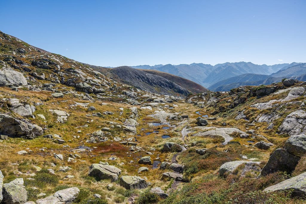 Na even bij Étang d’Arbu te hebben gezeten en met de drone te hebben gevlogen om te filmen zijn we verder gelopen richting Pic des Trois Seigneurs, die 2167 meter hoog is. We lopen eerst een stukje langs het meertje, maar het duurt niet lang of we moeten weer steil omhoog. De omgeving is prachtig met al die herfstkleuren. Iedere keer als we een stukje omhoog gelopen zijn en achterom kijken hebben we een ander uitzicht. De bergen op de achtergrond blijven hetzelfde, maar de voorgrond verandert continu. Door de regenval zijn er overal kleine poeltjes en stroomt er overal water. Ondanks de forse inspanningen kunnen we echt genieten.