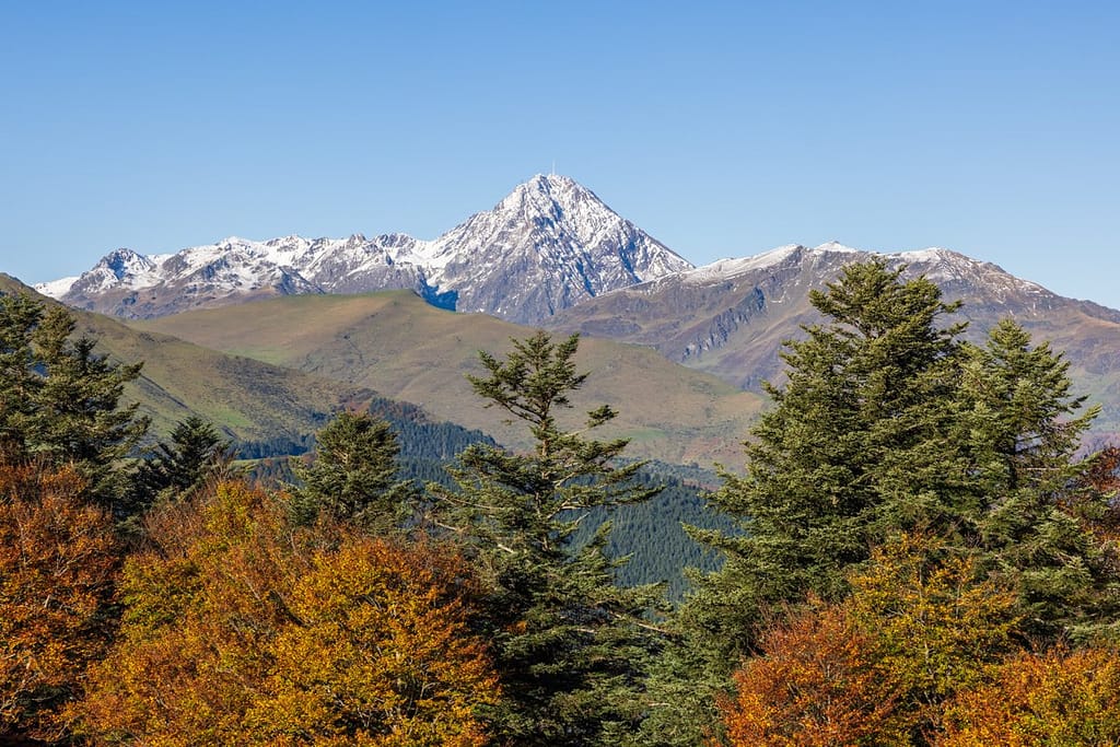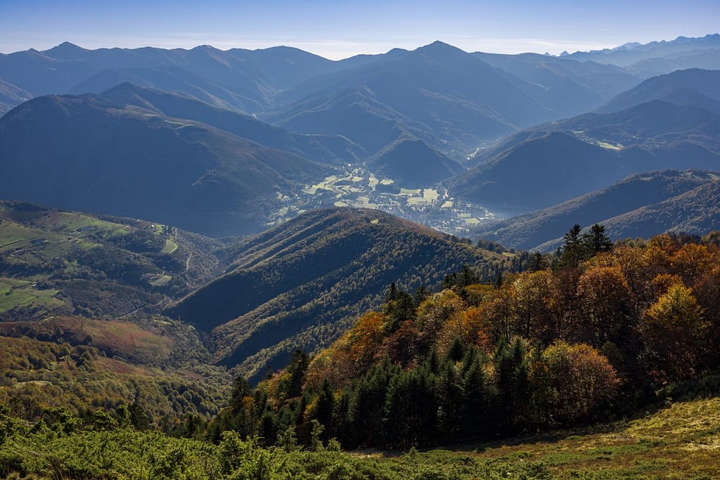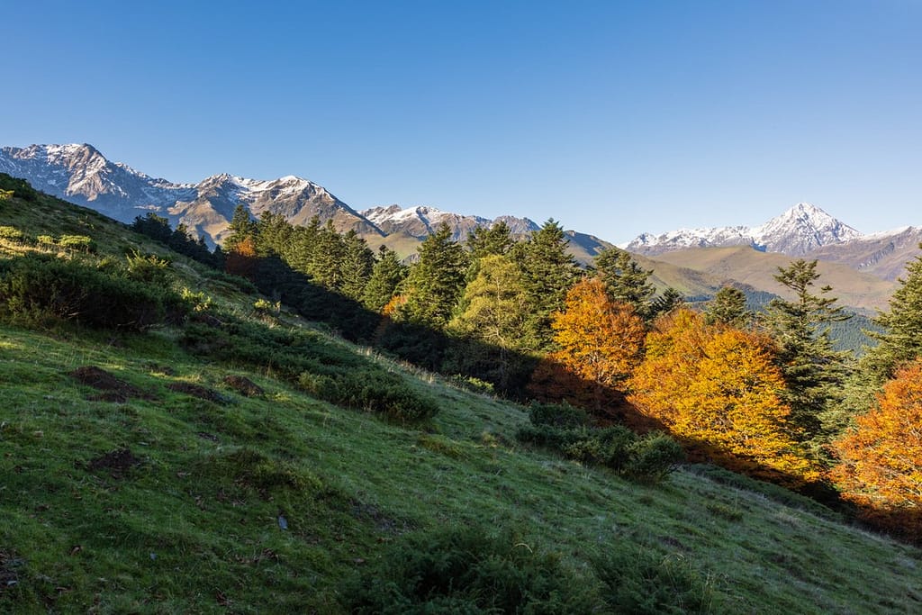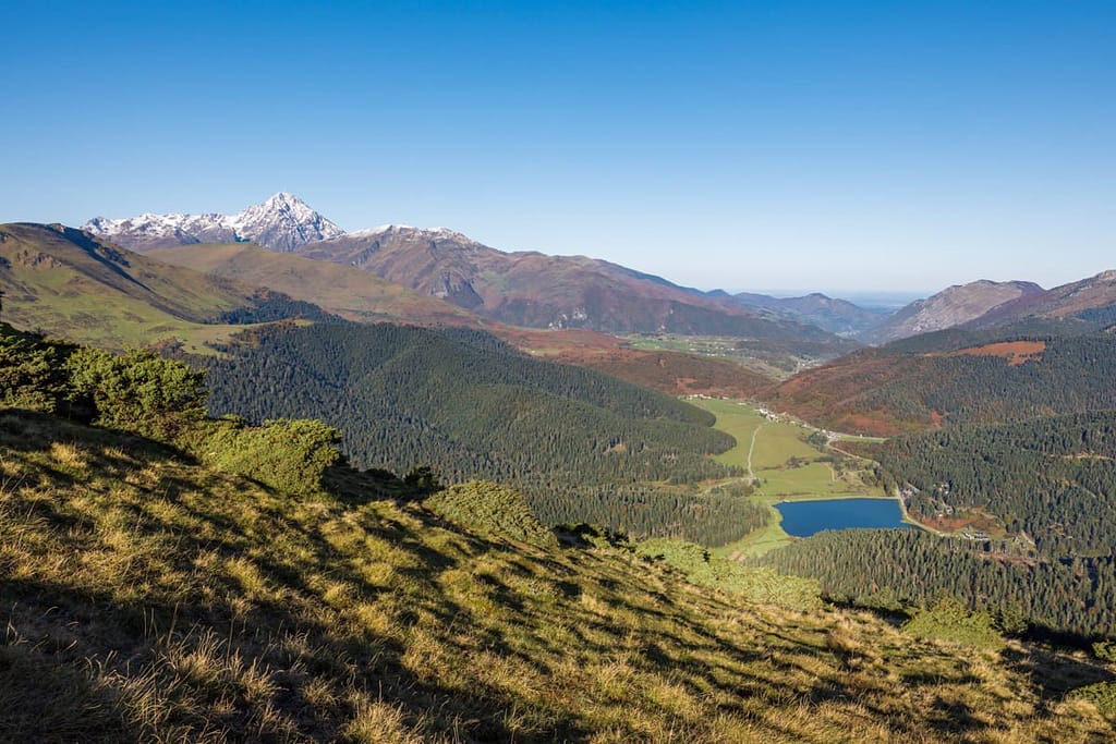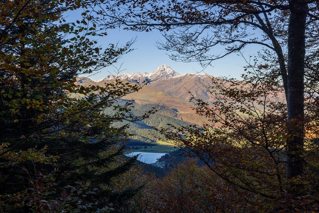 Vanaf hier wordt het pad nagenoeg vlak en lopen we door het bos. De herfstverkleuring is prachtig. Tussen de bomen door hebben we uitzicht op de besneeuwde toppen van de Pyreneeën. De Pic du Midi is ver weg, maar tekent zich duidelijk af tegen de horizon. In het dal zien we Lac de Payolle liggen.