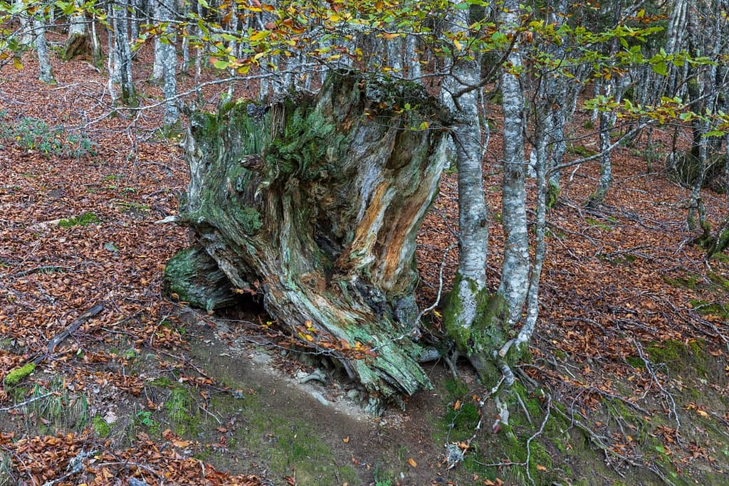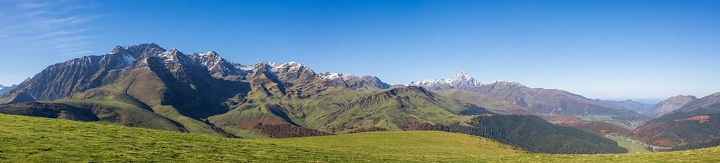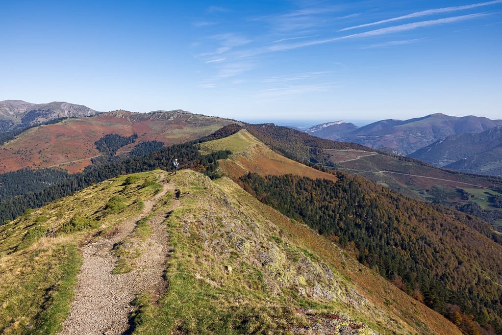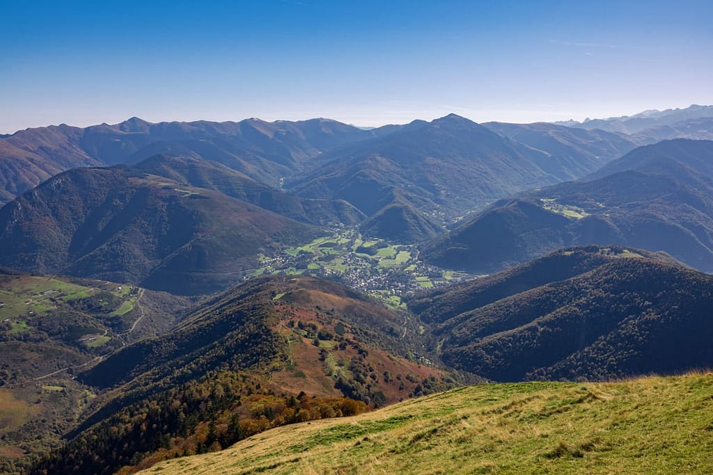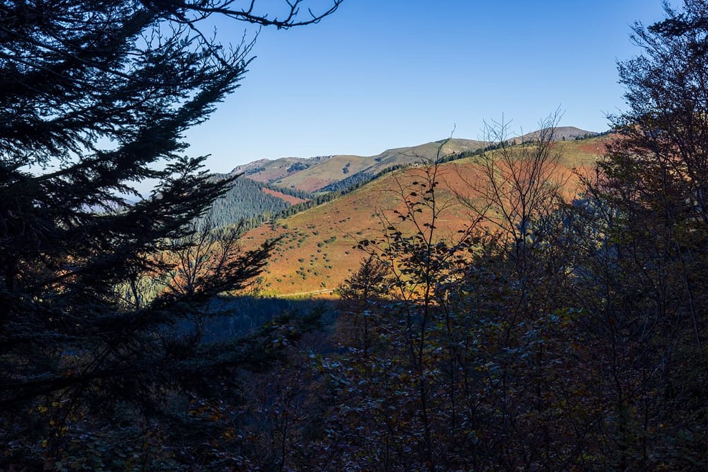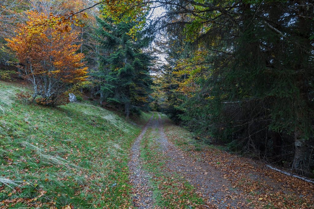 Vanaf hier wordt het pad nagenoeg vlak en lopen we door het bos. De herfstverkleuring is prachtig. Tussen de bomen door hebben we uitzicht op de besneeuwde toppen van de Pyreneeën. De Pic du Midi is ver weg, maar tekent zich duidelijk af tegen de horizon. In het dal zien we Lac de Payolle liggen.