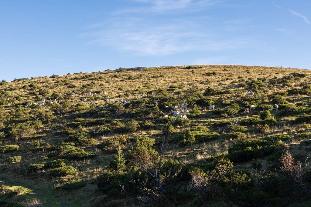 Na 3 kilometer lopen zijn we op het grote groene grasveld genaamd Plo del Naou op 1754 meter hoogte. We kunnen nu genieten van een 360° uitzicht. Er staat een paaltje op het hoogste punt, maar daar staat 1949 op. Dit zal wel het jaartal zijn dat deze is neergezet. We besluiten om hier even te blijven en met de drone wat filmopnames te maken.