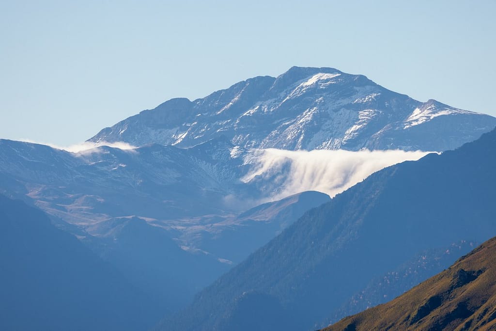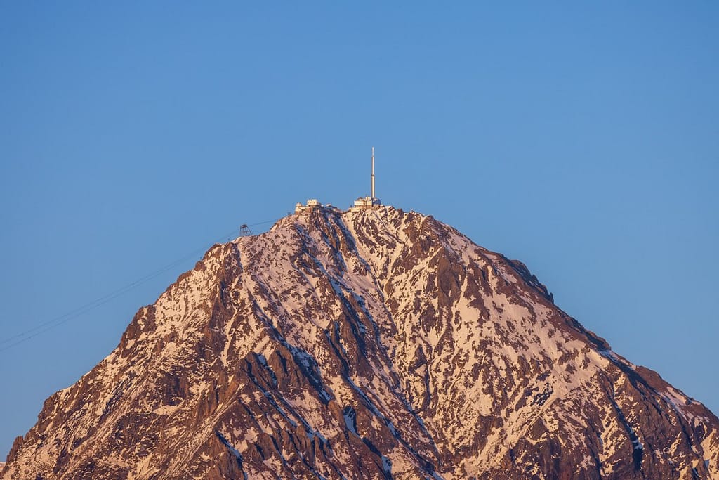 Vanaf de Col d’Aspin zien we in de verte de besneeuwde top van de Pic du Midi in de vroege morgenzon liggen. Met de telelens maken we er direct bij aankomst een foto van. Die warme kleuren duren nooit lang.